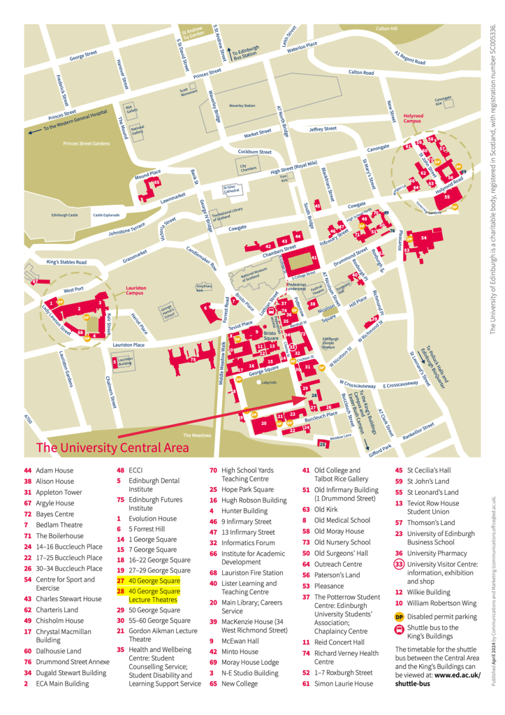 Main Conference Activities (such as keynote talks, panels, participant presentations, and the general assembly) – 40 George Square Lecture Theatres.